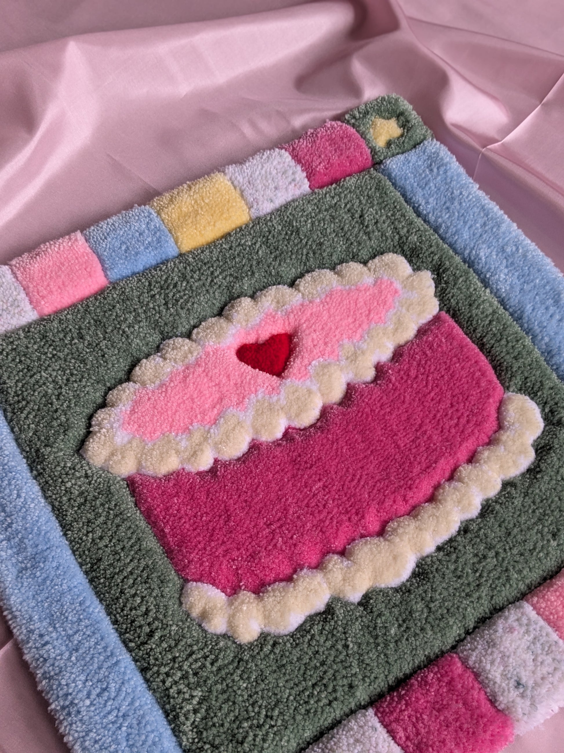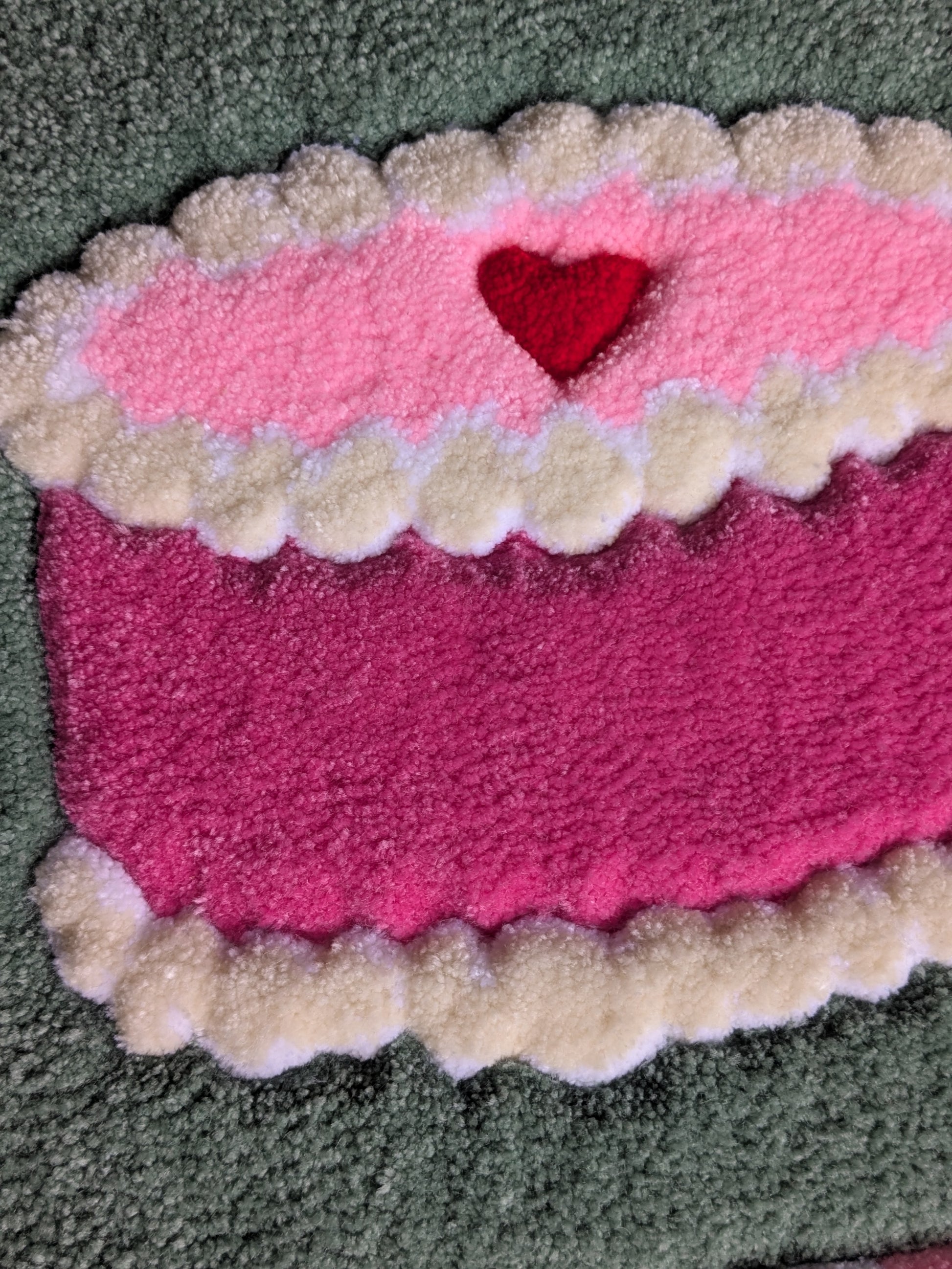 Pink tufted cake portrait with a d-ring hook on the back for hanging decor! Finished with felt backing.
