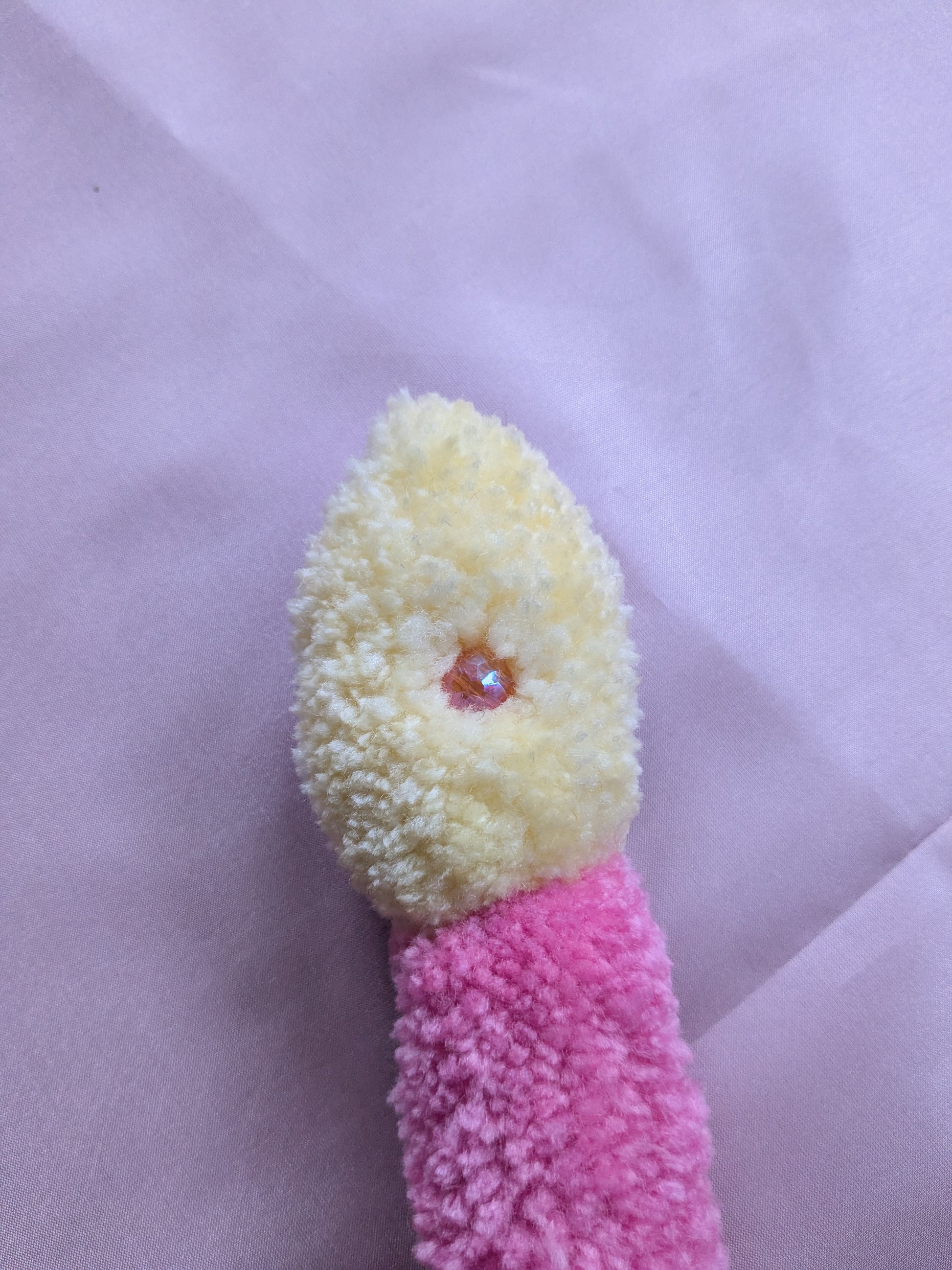 Tufted candlestick with orange bead in the center of the tufted flame. Backed with pink felt and a small d-ring hook for hanging!