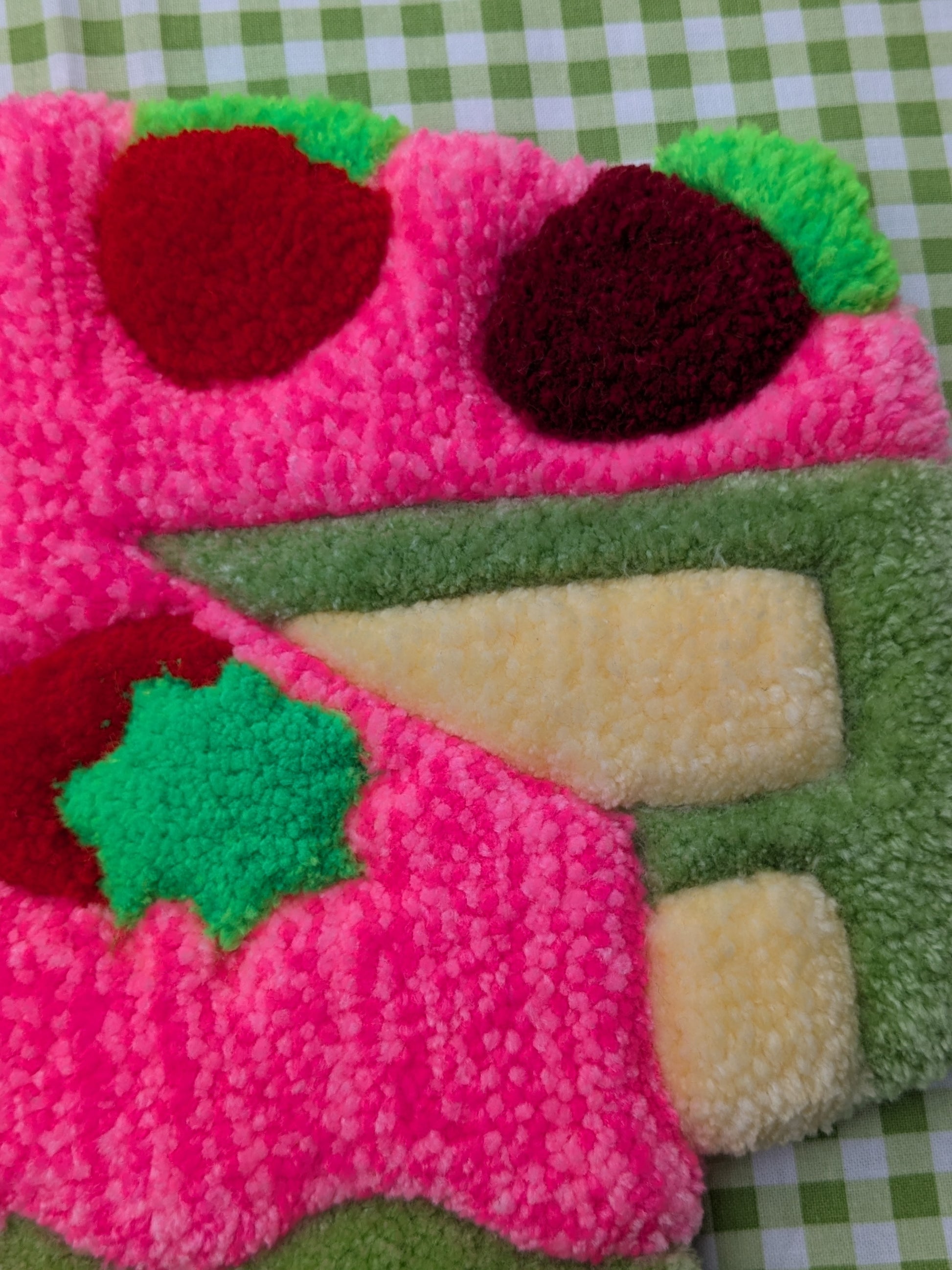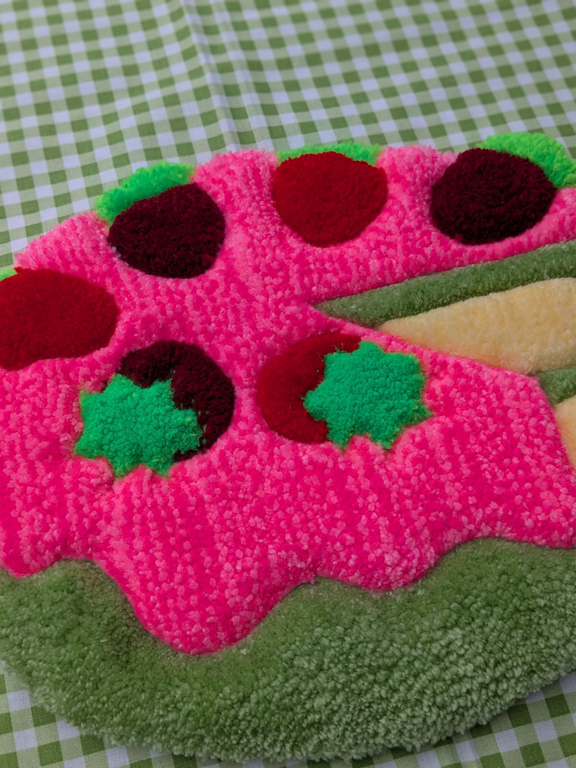 Tufted matcha cake with multicolor strawberries! Made with acrylic yarn and pink felt backing fabric. Hook included on the back to display your textile art.